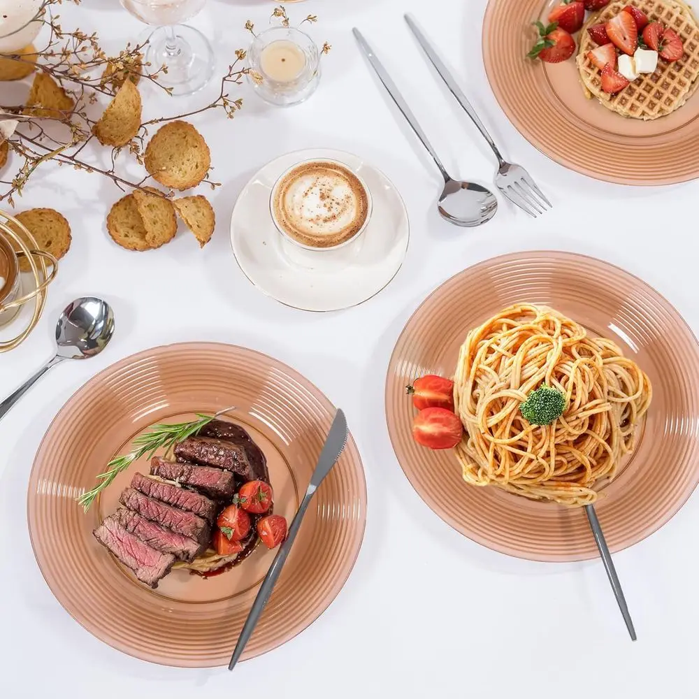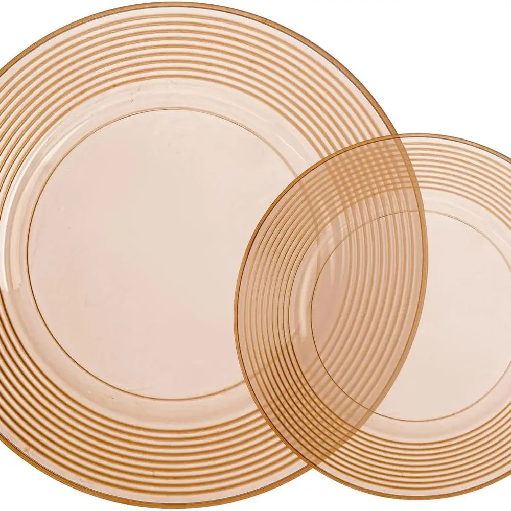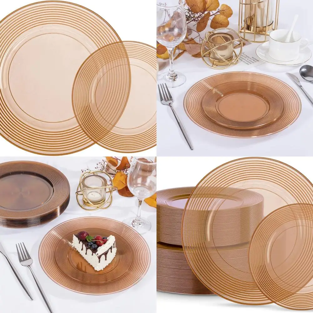 Value Set: This clear brown plates set includes 50 dinner plates (10) and 50 dessert plates (7), ideal for serving various dishes to 50 guests, from appetizers to desserts.