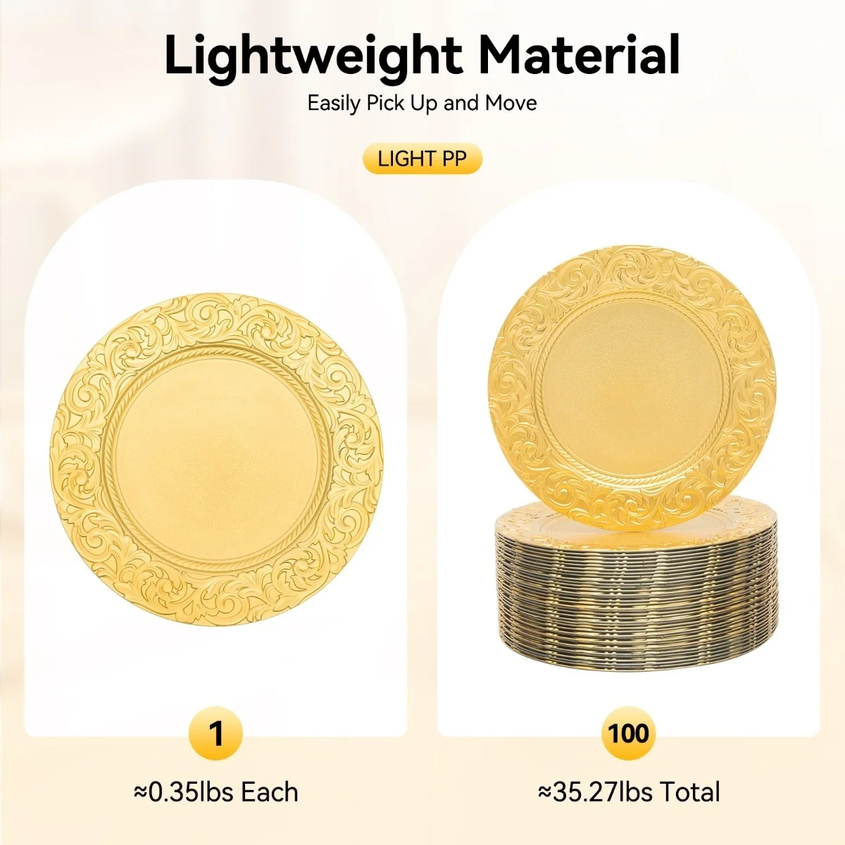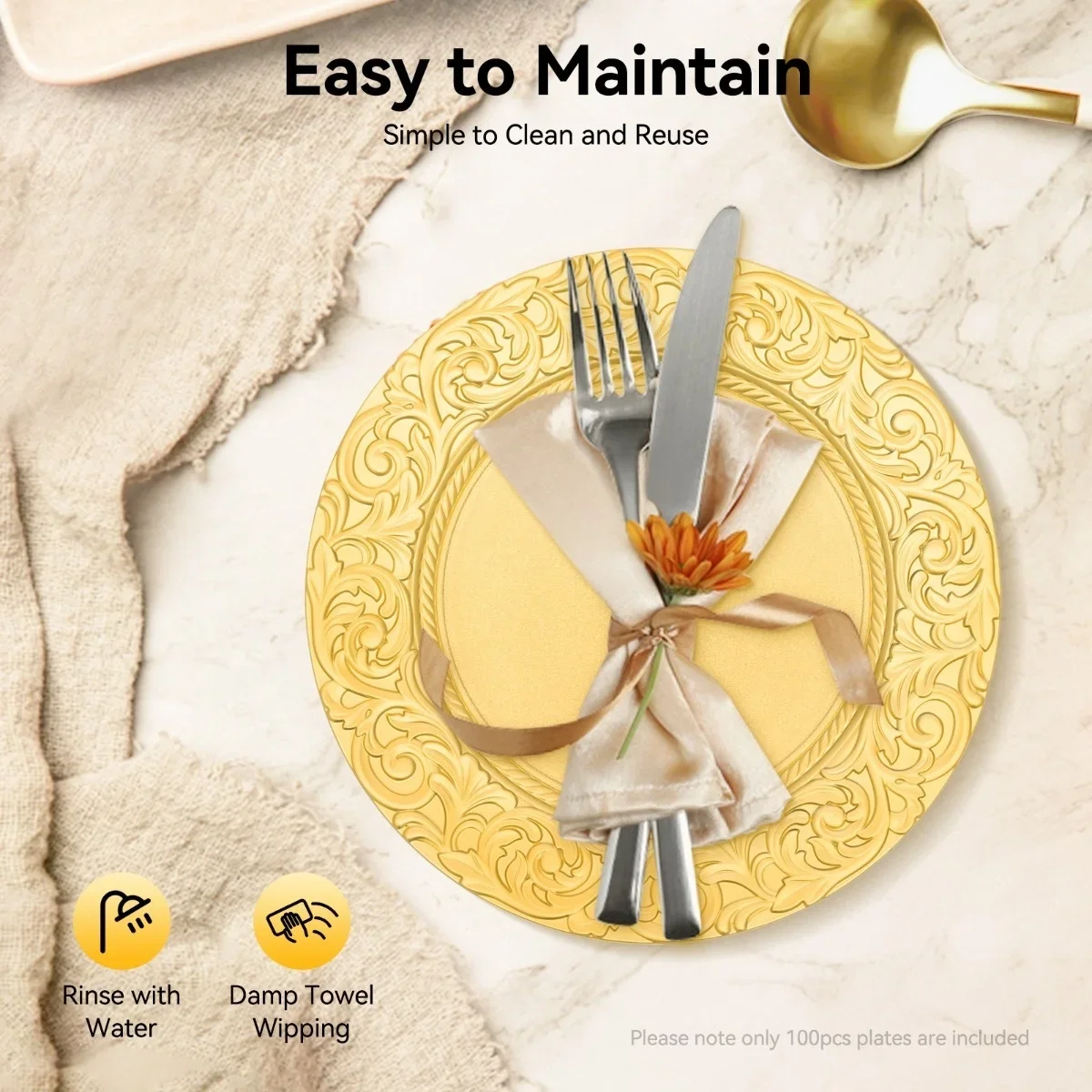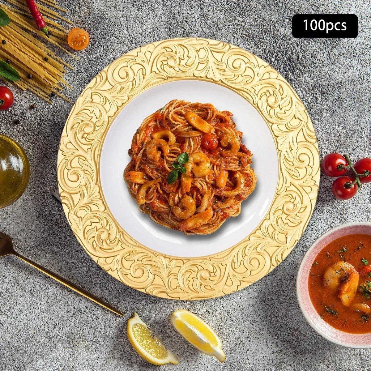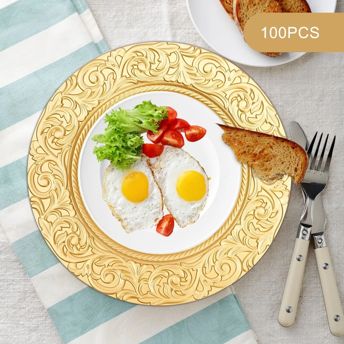 100 Pieces PP Round Charger Plates Set - RReusable Serving Plates Wedding Decorative Chargers Patterned Snack Trays Embosse